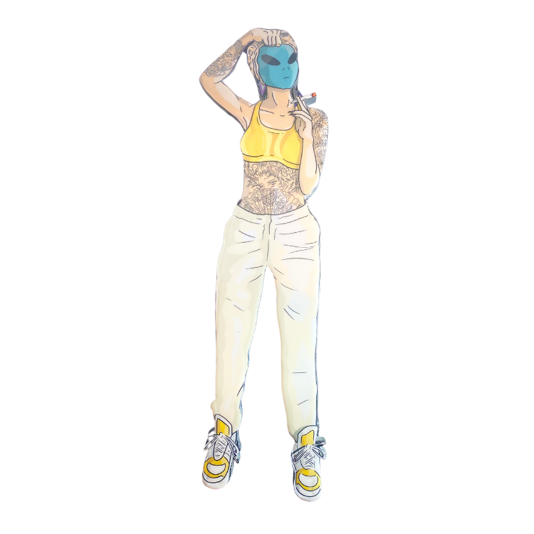 Ilustración moderna de una figura femenina con máscara alienígena turquesa, vistiendo un top amarillo deportivo y pantalones blancos. Combina elementos de moda urbana con ciencia ficción.