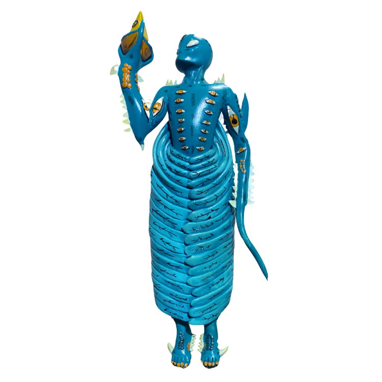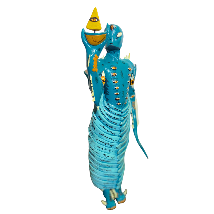 Figura alienígena estilizada en tonos turquesa con múltiples ojos y diseño orgánico. Arte conceptual que explora formas biomecánicas y patrones repetitivos.