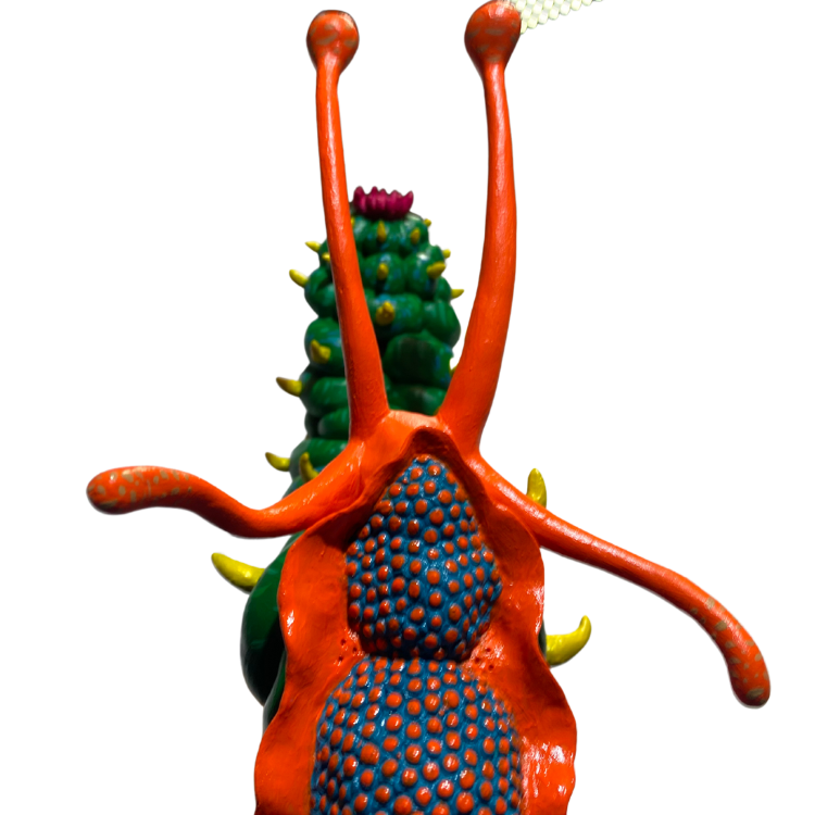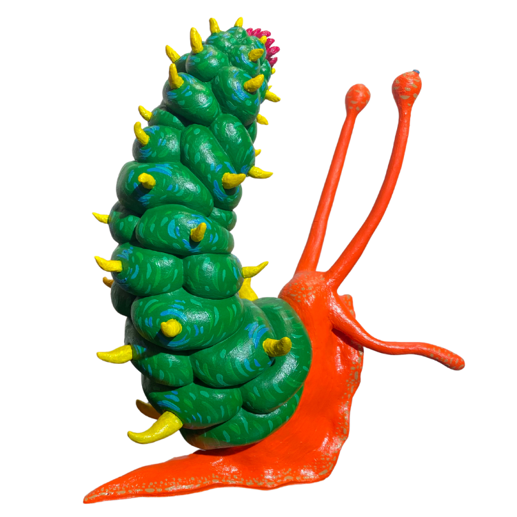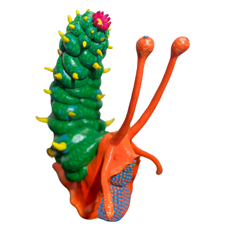Escultura artística que representa un caracol fantástico en vibrantes tonos verde y naranja. El cuerpo verde está adornado con espinas amarillas y una flor rosa en la corona, mientras que la base naranja presenta un fascinante patrón de puntos azules. Una pieza única que combina naturaleza y fantasía.